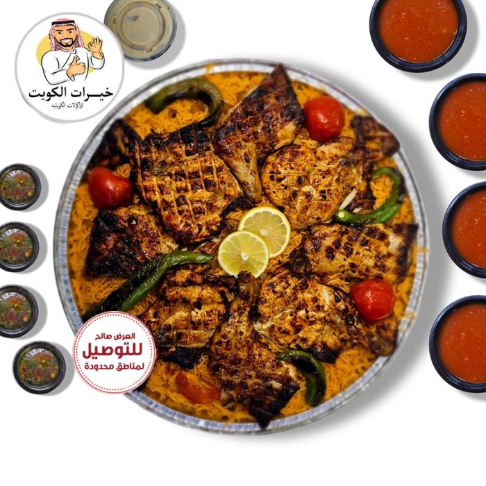 عيش بخاري مع دجاج مشوي علي الفحم تكفي 4 أشخاص مطعم خيرات الكويت