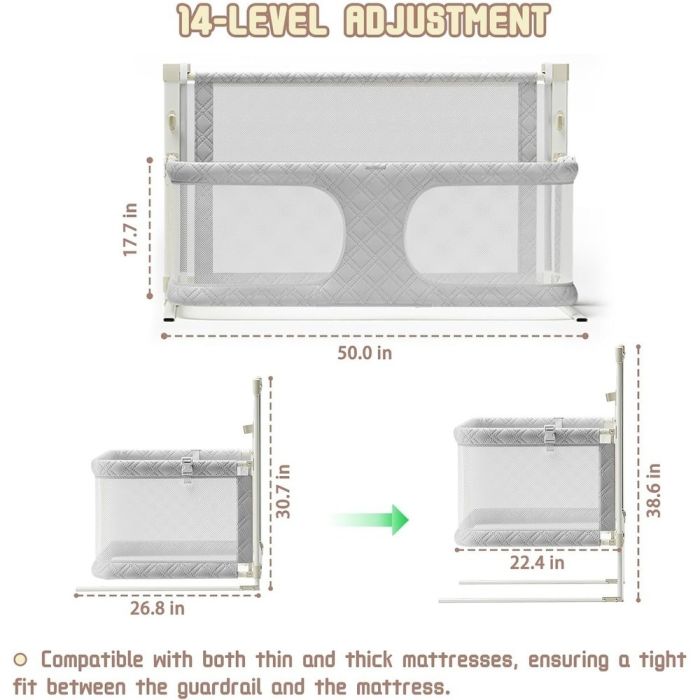 وفر لطفلك نومًا آمنًا وهادئًا مع حاجز السرير الجانبي للأطفال 3 في 1 الذي يجمع بين الراحة، الحماية والتعددية. هذا الحاجز القابل للطي يسمح بالاحتضان القريب للطفل أثناء النوم، ويضمن الحماية من السقوط، مع تصميم آمن وحواف مستديرة. مناسب لجميع أنواع الأسرة وقابل للنقل بسهولة