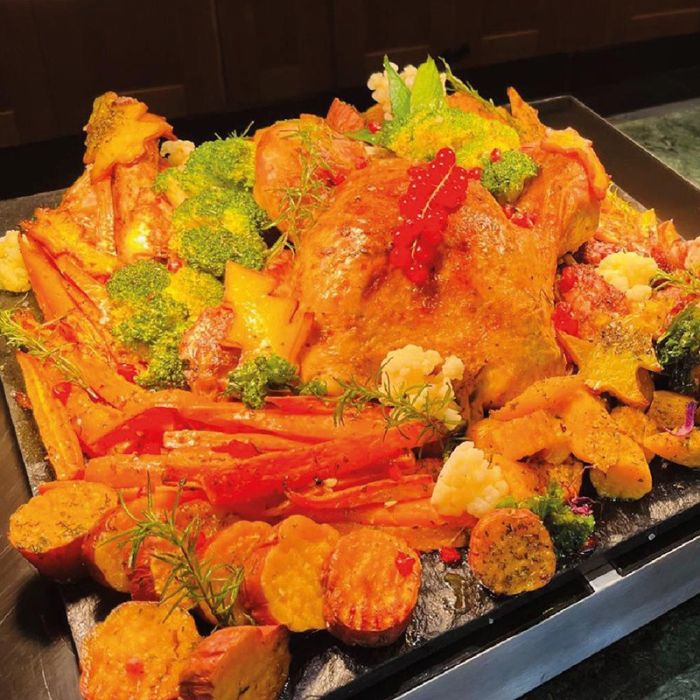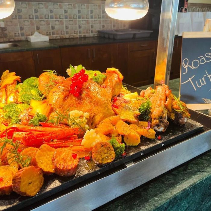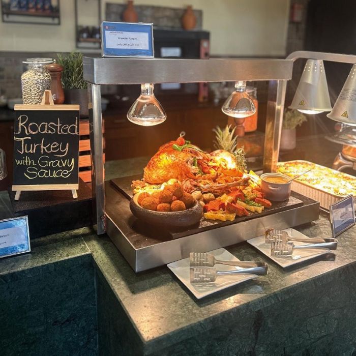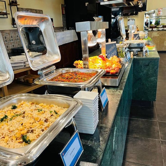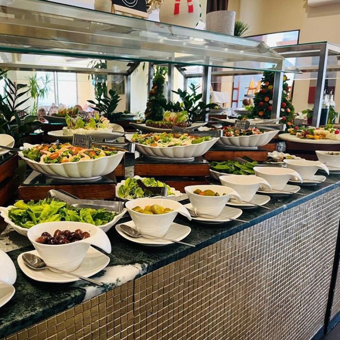بوفيه الغداء يشمل : ديك رومي، ستيك، دجاج، أنواع مختلفة من المعكرونة، أرز، خضراوات، مقبلات، سلطات، حلويات،