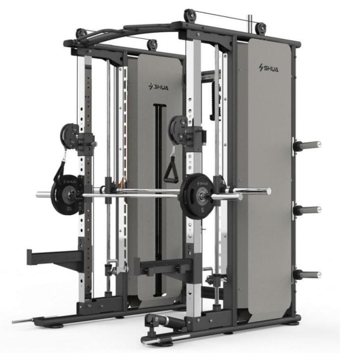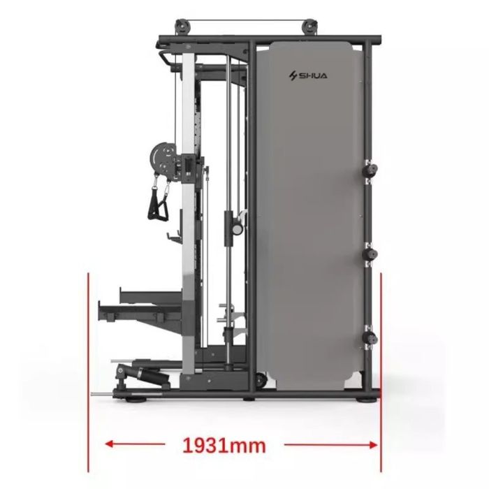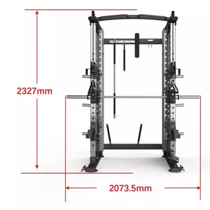اختبر النظام المتكامل المطوّر لبناء القوة، الذي يجمع بين جهاز سميث، ونظام الكابلات المتقاطعة، ورفّ القوة الاحترافي. مصنوع من فولاذ متين بقياس 75×75 مم وقدرة تحمّل 600 كجم، ويتميز بـ20 مستوى ضبط، وذراع متوازن، وبار سحب متعدد القبضات لتجربة تمرين شاملة ومتنوعة