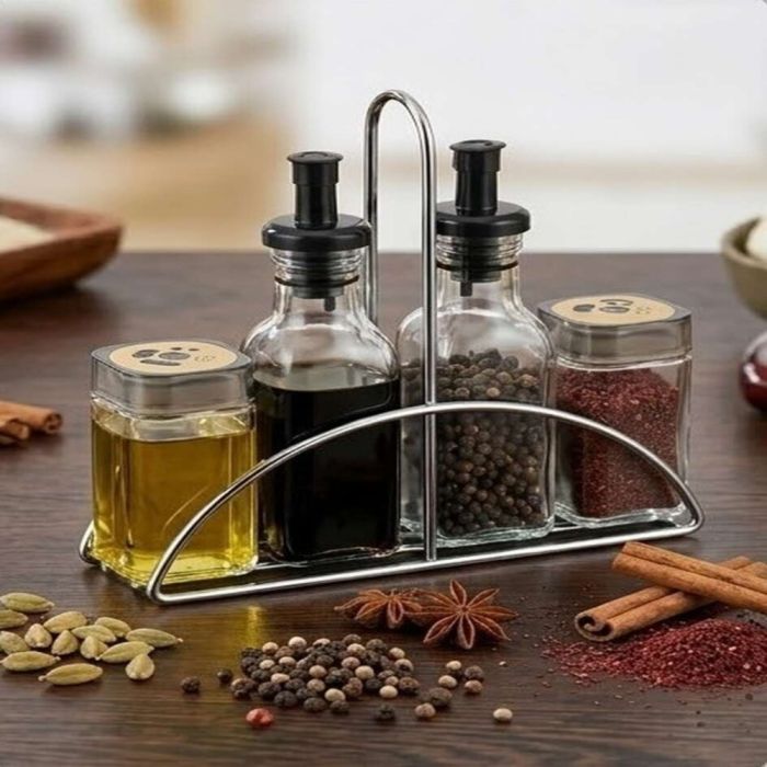 أضف لمسة من الترتيب والأناقة إلى سطح المطبخ مع طقم عملي يحافظ على التوابل والصلصات في مكان واحد بشكل منظم. يجمع هذا الطقم المكون من 4 قطع بين حفظ التوابل السائلة والصلبة ضمن تصميم مدمج مناسب للاستخدام اليومي أثناء الطهي أو التقديم على المائدة. كما تساعد العبوات الزجاجية الشفافة على رؤية المحتوى بسهولة، بينما يمنح الحامل المعدني بلمسته الأنيقة مظهرًا مرتبًا ويسهّل حمل الطقم ونقله عند الحاجة.