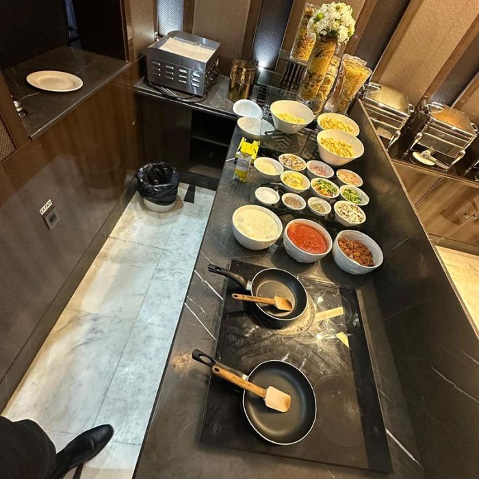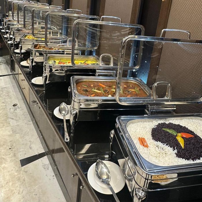 بوفيه رمضاني يتكون من : السلطات، مازة باردة وساخنة بالإضافة إلى أطباق رئيسية وركن الطهي الحي، الحلويات مع المشروبات الرمضانية ،المياه ، القهوة والشاي.