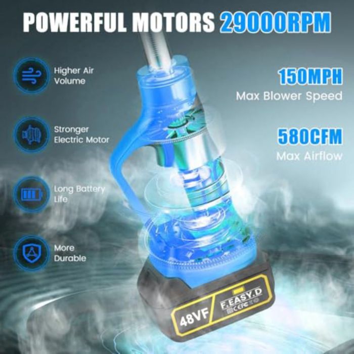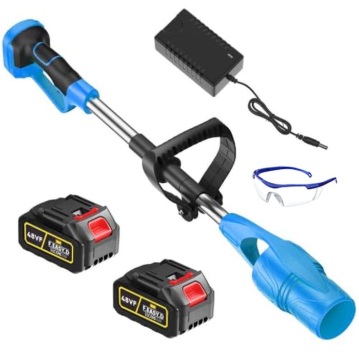 منفاخ هواء يدوي لاسلكي مع عصا قابلة للتمديد 48 فولت مصنوع من تصميم قوي يمنح تدفق هواء عالي، يساعد على تنظيف الأوراق والغبار بسهولة، مزود بسرعة متغيرة للتحكم الدقيق، بطاريتان قابلة للشحن توفران استخدام أطول مع راحة أثناء الاستخدام