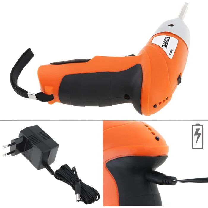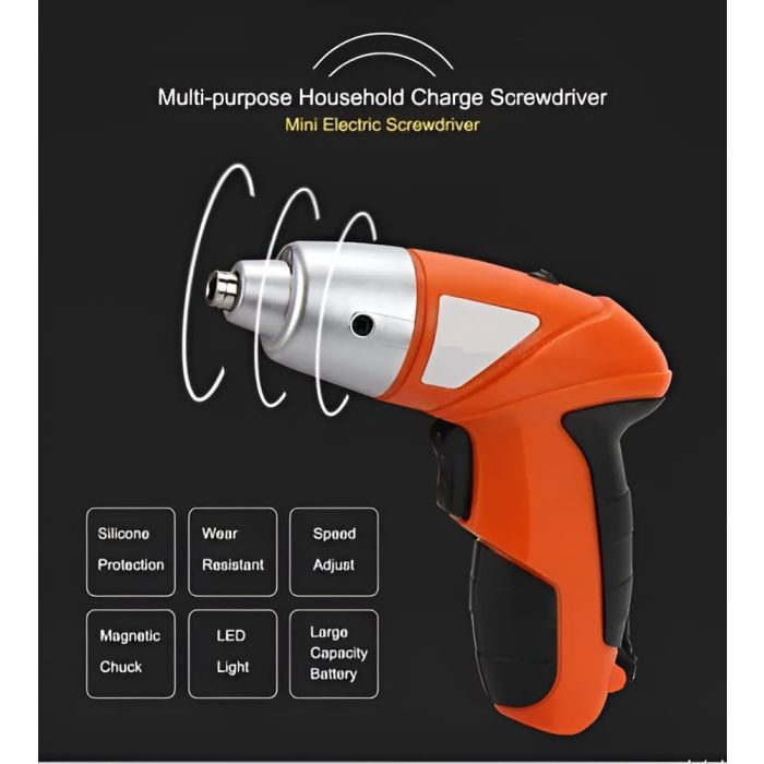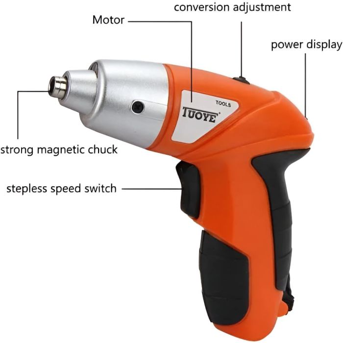 - مفك البراغي الكهربائي قابل لإعادة الشحن، مما يُغني عن استبدال البطارية باستمرار. تصميمه اللاسلكي يُعزز سهولة الحركة، مما يسمح لك بالعمل بكفاءة دون الحاجة إلى التقيد بمنافذ الطاقة.