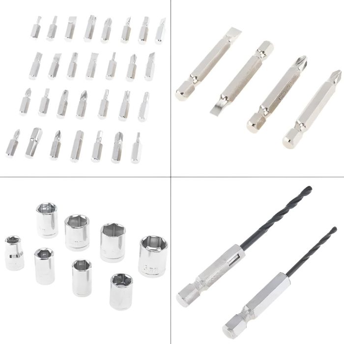 - تحتوي هذه المجموعة على 45 قطعة أساسية، بما في ذلك رؤوس المثقاب والملحقات، مما يوفر لك حلاً شاملاً لمختلف مهام الحفر والربط.
