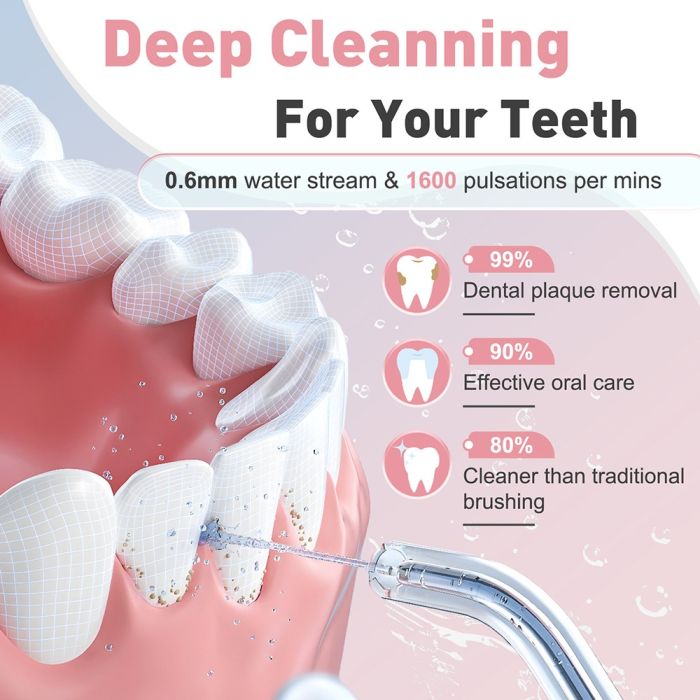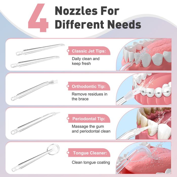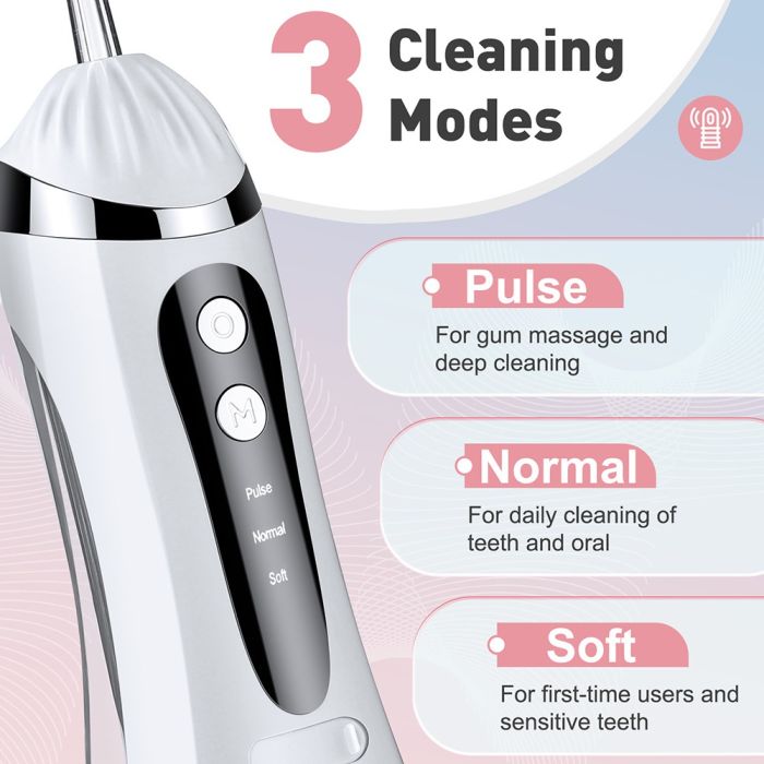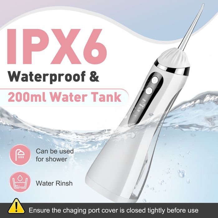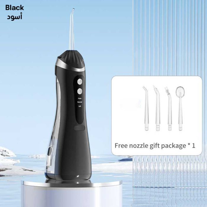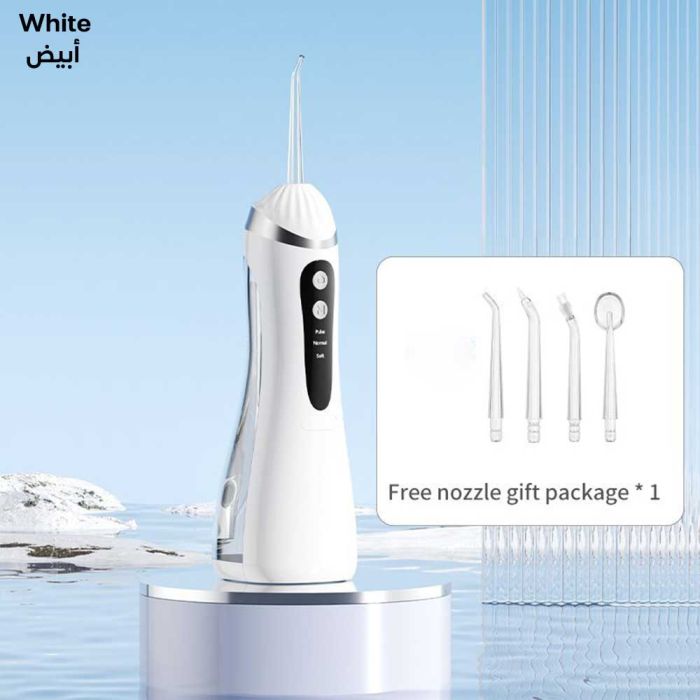 أسنان لامعة تضيء حياتك، حافظ على ابتسامة مشرقة مع جهاز تنظيف الأسنان بضغط الماء، يقوم بإزالة بقايا الطعام بين الأسنان واللثة بشكل فعال من الأماكن التي لا يمكن لفرشاة الأسنان والخيط التقليدي الوصول إليها، كما أنه مثالي لمستخدمي تقويم الأسنان أيضاً، حيث ثبت أنه أكثر قوة وفعالية بثلاث مرات في إزالة طبقة البلاك، مجهز ببطارية قابلة للشحن، خزان ماء سعة 200 مل مع 4 رؤوس قابلة للتبديل