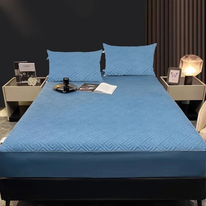 استمتع بنوم هادئ مع غطاء السرير القطني المزدوج بثلاث طبقات تحافظ على الحرارة وتمنع الانزلاق، طبقة مضادة للبكتيريا، وناعمة كالحرير، مع حزام مطاطي 360° ورائحة عشبية خفيفة تمنحك انتعاشاً وراحة تامة طوال الليل.