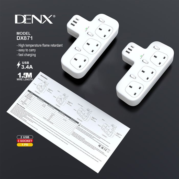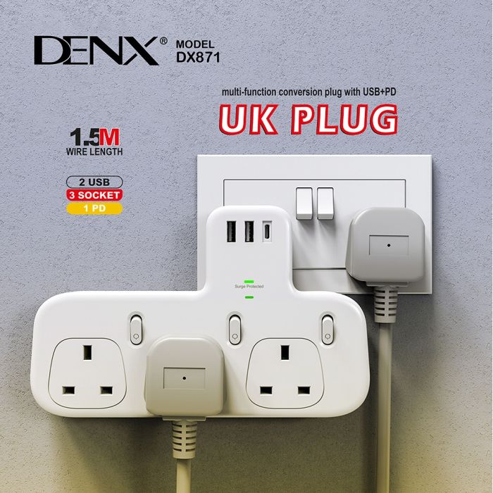 - موسع منافذ كهرباء UK مع 3 مخارج ومنفذ PD و 2 منفذ USB من DENX