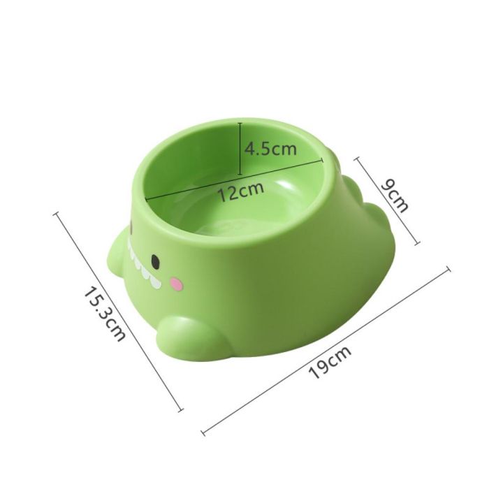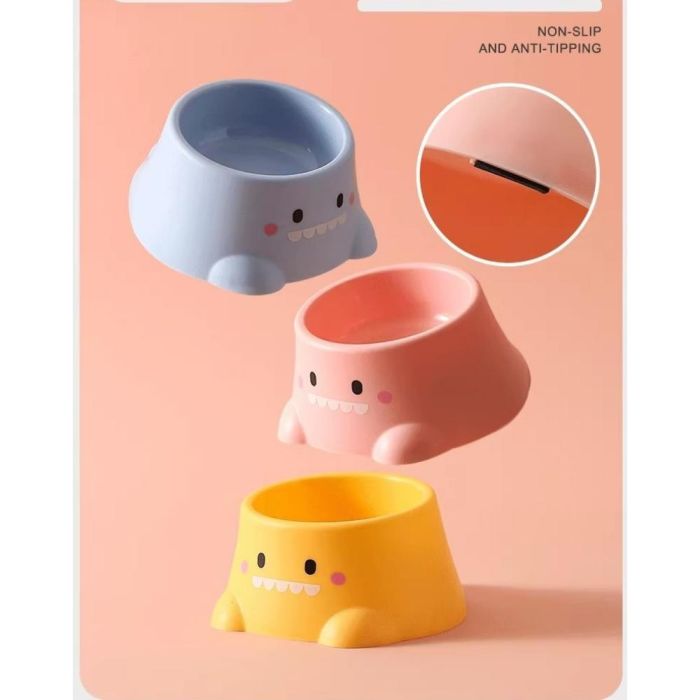 وعاء طعام للحيوانات الأليفة بتصميم ديناصور، مصنوع من مواد متينة، يتميز بهيكل مرتفع يقلل من الانسكابات، ومظهر مرح، مناسب للقطط والكلاب