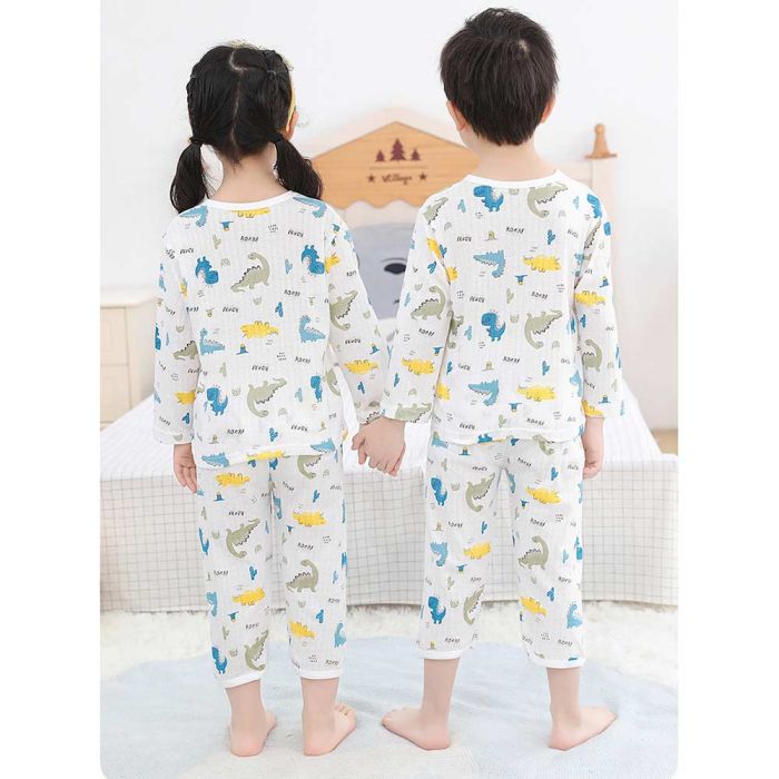 طقم بيجامة صيفي بأكمام طويلة من القطن الخالص بطبعة ديناصورات للأولاد والبنات