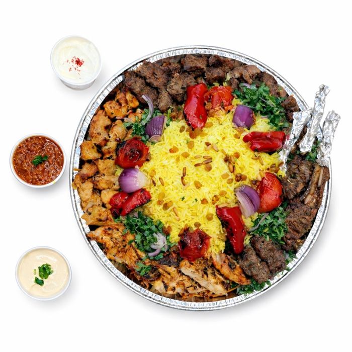 استمتع بتشكيلة شهية من المشاوي تشمل كباب دجاج، كفتة، كباب خشخاش، كباب لحم وكباب أورفلية، تُقدَّم مع الأرز والخضار المشوية — تجربة غنية بالنكهات لمحبي المشاوي الأصيلة.