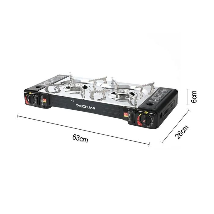 حوّل أي مكان إلى مطبخك الخارجي الخاص! استمتع بتحضير وجباتك بسرعة وسهولة بفضل موقد الغاز المزدوج المحمول. تصميمه الخفيف والمتين يجعله رفيقك المثالي في التخييم والنزهات، موفرًا لك القدرة على الطهي بوعاءين في نفس الوقت.