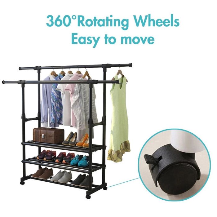 إذا كنت تبحث عن وسيلة رائعة لتنظيم ملابسك وأحذيتك بكل سهولة، رف الملابس المزدوج مع منظم هو الخيار المثالي! مصمم من مواد متينة وعالية الجودة، يوفر لك مساحة واسعة لترتيب الملابس والأحذية بشكل منظم. مع رفوف متعددة للأحذية والأكسسوارات، ورافين لتعليق الملابس الثقيلة. سهل الاستخدام والتركيب، ومناسب للاستخدام في المنزل أو في غرف الغسيل. كما أنه مزود بعجلات متحركة لسهولة التنقل من مكان إلى آخر