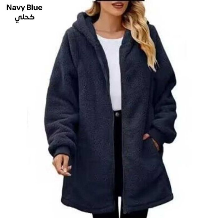 معطف كارديجان شتوي فضفاض بغطاء رأس وسحاب مزدوج الوجه