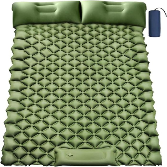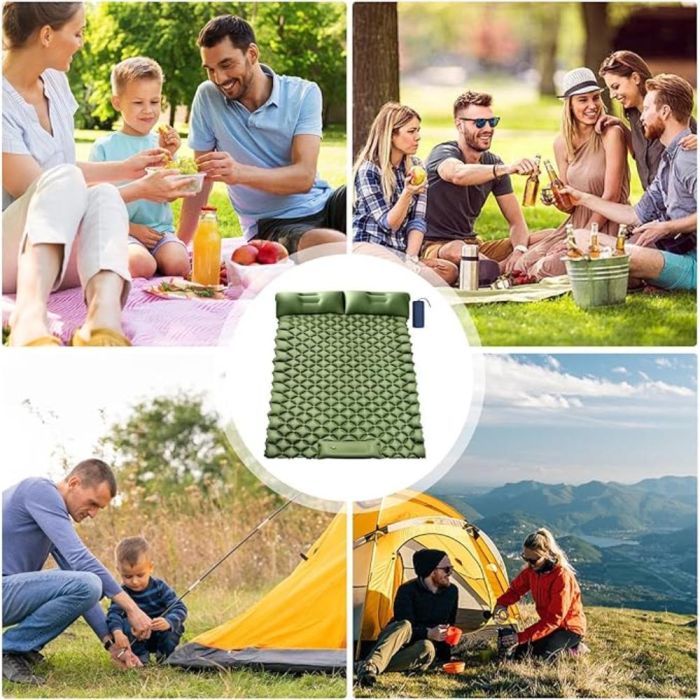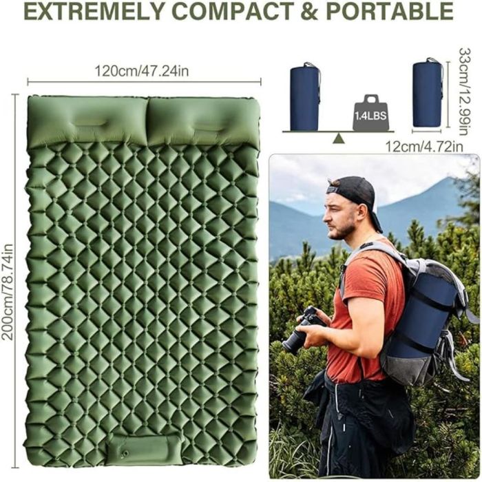 استمتع براحة لا مثيل لها في الهواء الطلق مع هذه المرتبة الهوائية المزدوجة القابلة للنفخ، رفيقك المثالي على جميع التضاريس. مصممة للتخييم والسفر، مصنوعة من نايلون 40D عالي الجودة مع طبقة من البولي يوريثان الحراري، مما يضمن مقاومتها للماء والتمزق والخدش.