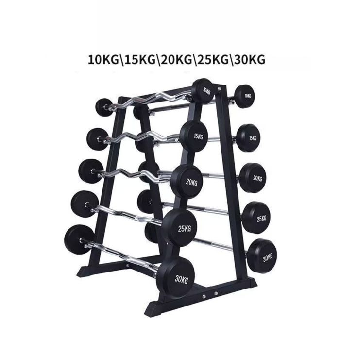 مجموعة احترافية تضم بارات مستقيمة ومموجة بأوزان ثابتة تتراوح بين 10 و50 كجم، تأتي مع ستاند معدني مزدوج متين للتخزين المنظم وسهولة الوصول أثناء التمرين. مصنوعة من فولاذ قوي وأوزان مطاطية عالية الكثافة لضمان أداء آمن ومظهر احترافي يناسب الصالات الرياضية.