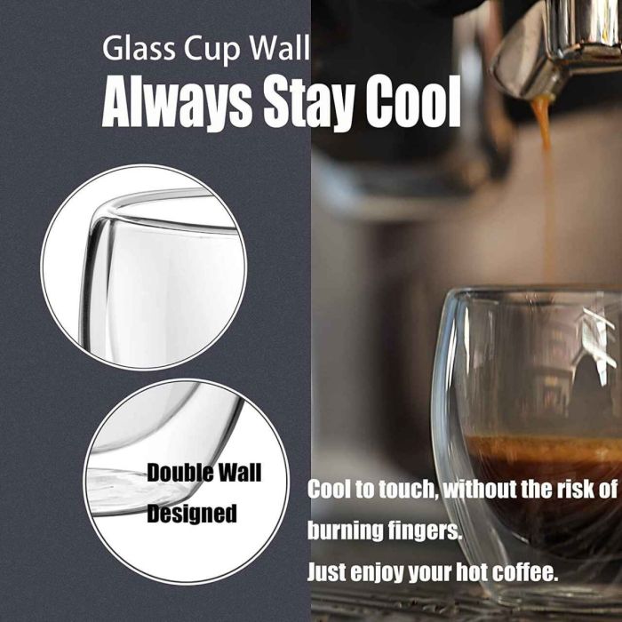 لمسة زجاجية أنيقة تجعل القهوة تبدو أرتب وتُقدَّم بشكل أجمل. هذا الكوب الزجاجي مزدوج الجدار مصمم للمساعدة في الحفاظ على حرارة المشروب لفترة أطول مع سطح خارجي أكثر راحة عند الإمساك، وبمظهر شفاف يبرز طبقات الرغوة ولون القهوة بشكل واضح. كما أن تصميمه القابل للتكديس يجعل التخزين أسهل وأكثر ترتيبًا، ليكون خيارًا عمليًا للإسبريسو والكابتشينو واللاتيه والشاي والمشروبات الباردة.