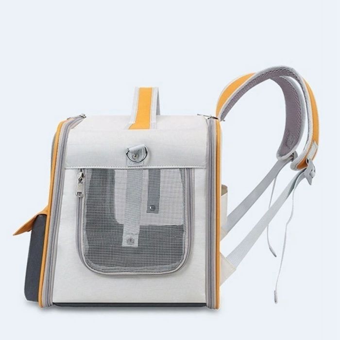 حقيبة ظهر متينة للحيوانات الأليفة، مقاومة للماء، مزودة بألواح جانبية. تتميز بتصميم قوي ومتين، مع تهوية جيدة من خلال فتحات جانبية لراحة الحيوان.