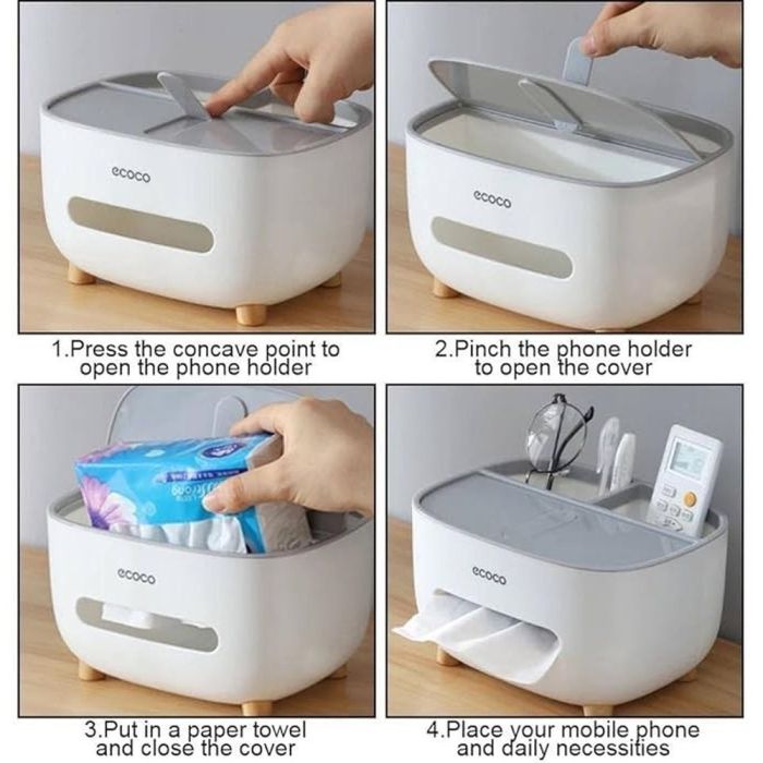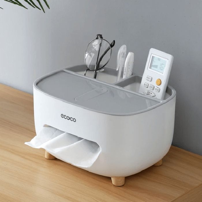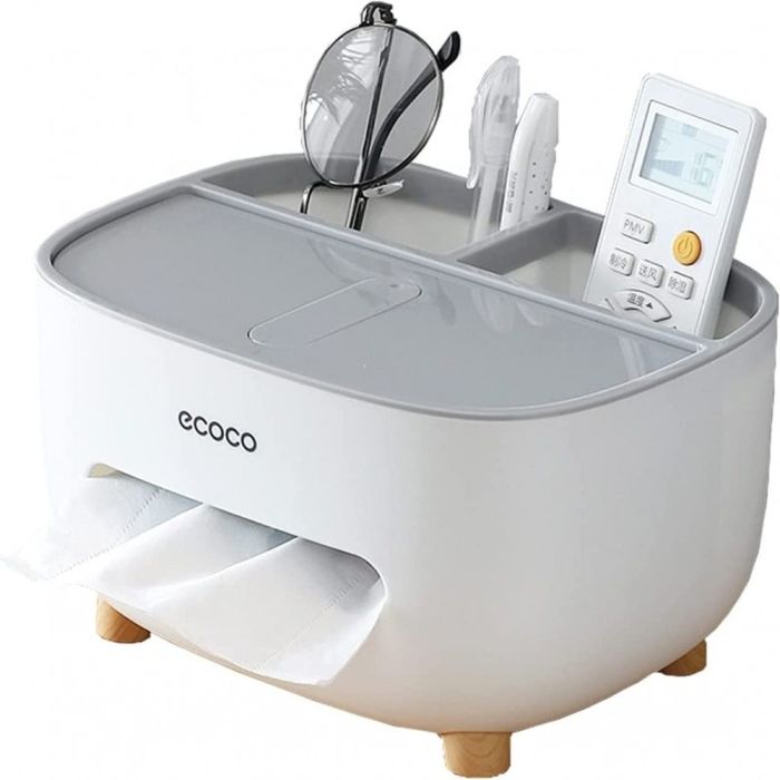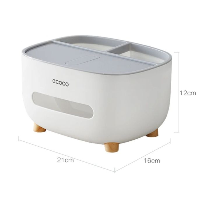 منظم وعلبة مناديل أنيقة من Ecoco بتصميم عصري، مزود بغطاء علوي مع تقسيمات لحفظ الريموت أو الأدوات الصغيرة. فتحة أمامية لسهولة سحب المناديل، وخامة بلاستيك متينة مع أرجل خشبية أنيقة تناسب أي ديكور.