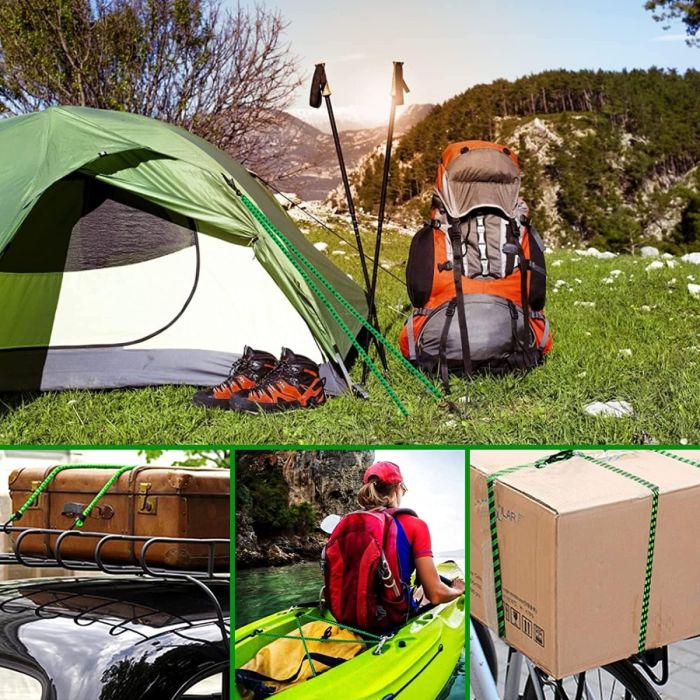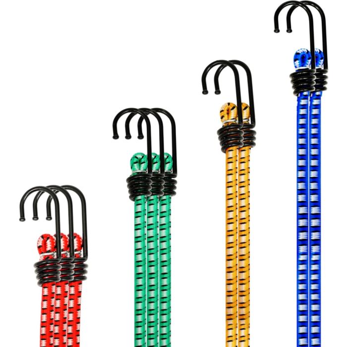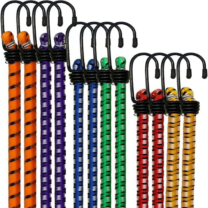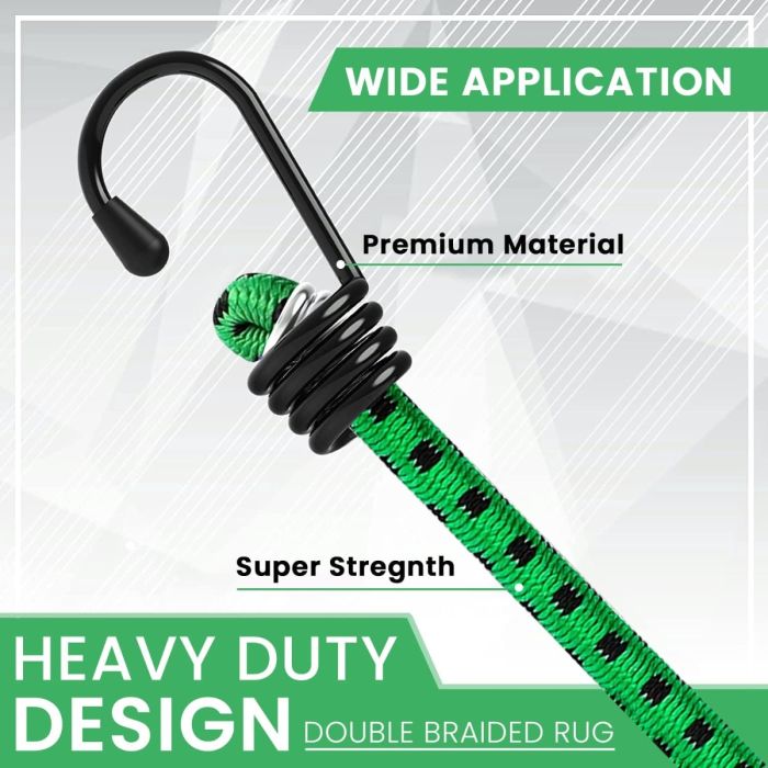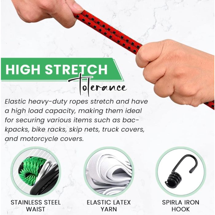 هذه الحبال متعددة الاستخدامات مثالية لمجموعة متنوعة من الاستخدامات، بما في ذلك تأمين الأمتعة، معدات التخييم، الأغطية، وإكسسوارات الدراجات النارية. مصنوعة من مواد مقاومة للعوامل الجوية والأشعة فوق البنفسجية، تم تصميمها لتحمل الظروف الخارجية القاسية. توفر الخطافات الفولاذية عالية الشد ثباتًا موثوقًا، بينما يضمن المطاط المرونة والمتانة.