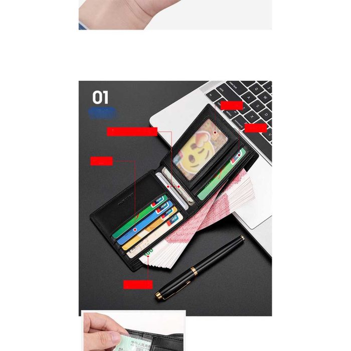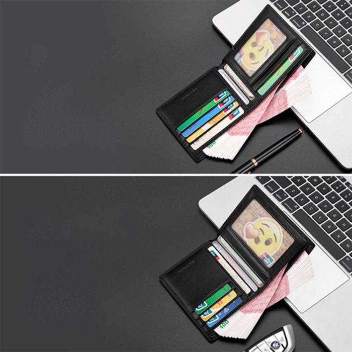 تصميم أنيق بلمسة جلد طبيعي من الطبقة العلوية، يوفر تنظيمًا عمليًا ومظهرًا عصريًا. المحفظة مزودة بخاصية الحماية من قراءة RFID لحماية بياناتك، وتحتوي على أماكن مخصصة للبطاقات، الهوية، ورخصة القيادة، بالإضافة إلى قسمين منفصلين للأوراق النقدية. مناسبة للاستخدام اليومي بتصميم رأسي أو أفقي يلائم مختلف الأذواق.