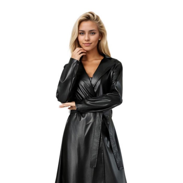 معطف جلد طويل للسيدات مصنوع من خامة ناعمة تمنح مظهراً أنيقاً ومتوازناً، بتصميم عصري يمنح حضوراً لافتاً، ويضفي لمسة راقية تناسب الإطلالات اليومية والمسائية، مع قصة انسيابية تعزز جاذبيتك بأسلوب فخم وجميل