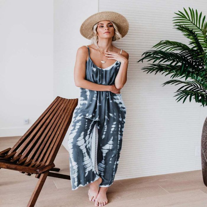 بدلة بأرجل واسعة للسيدات مصنوعة من خامة جذابة ومريحة، تتميز بتصميمها الجريء ذي الأرجل الواسعة والرباط الأمامي لإطلالة أنيقة ومثيرة، توفر مظهراً فضفاضاً ومريحاً، مثالية للحفلات والإطلالات الغربية العصرية.