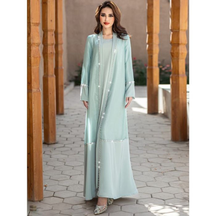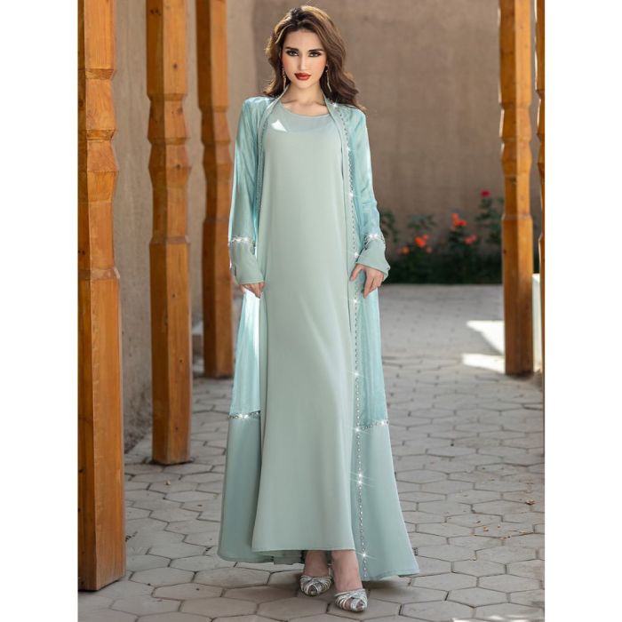 طقم فستان وعباية مرصعة للسيدات مصنوع من بوليستر، بتصميم أنيق يجمع بين الفستان الداخلي والعباية الخارجية بانسيابية راقية، الترصيع الناعم يضيف لمسة فخامة هادئة، يمنح إطلالة محتشمة ومميزة للمناسبات الراقية