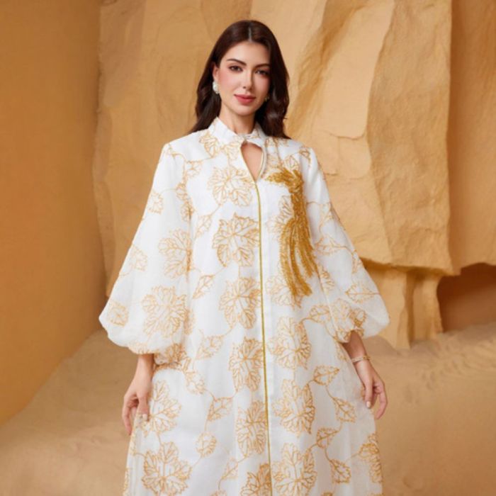 - يتميز بتصميم مزين بنقوش أنيقة يمنح الإطلالة حضوراً لافتاً