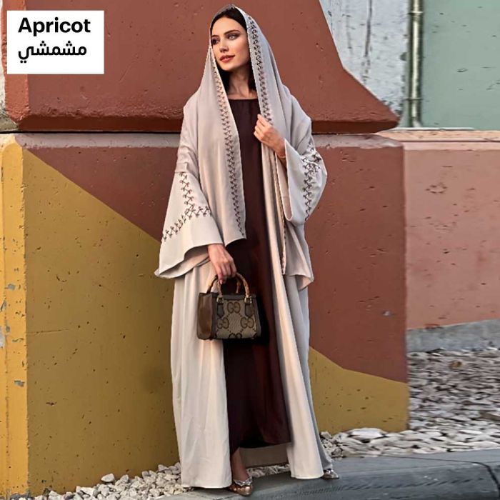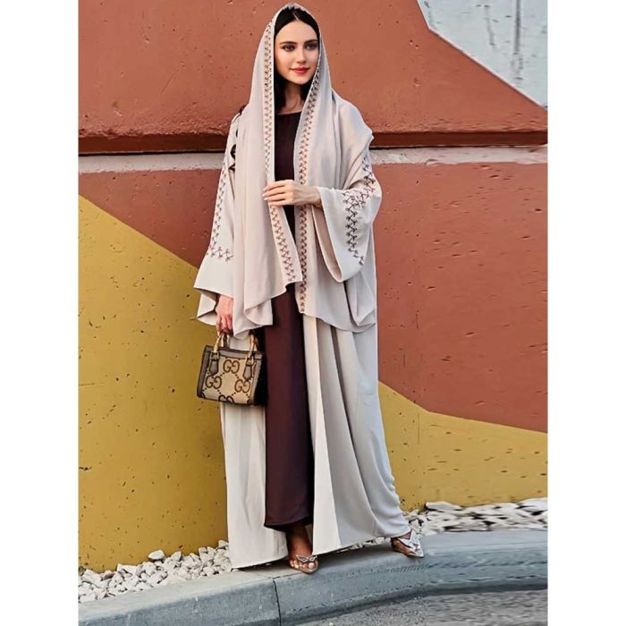 عباية مطرزة راقية مع حجاب للسيدات مصنوعة من خامة أنيقة بتصميم مفتوح وأكمام واسعة، تتميز هذه العباية بتطريز دقيق يضيف لمسة من الرقي والفخامة، إنها مثالية للمناسبات وتوفر إطلالة محتشمة وجميلة، كما أنها تأتي مع حجاب متناسق لتكتمل الأناقة، وهي قطعة أساسية للموضة الإسلامية المعاصرة، وتضمن مظهراً جذاباً ومريحاً، وتحافظ على جودتها بفضل التفاصيل المتقنة.
