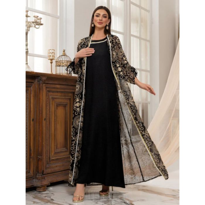 طقم فستان وعباية مطرزة أنيق للسيدات مصنوع من بوليستر فاخر بتصميم راقٍ يبرز التفاصيل المترفة، يمنح إطلالة متناسقة وجذابة، يجمع بين الانسيابية والراحة، مناسب للمناسبات الراقية والظهور الأنيق
