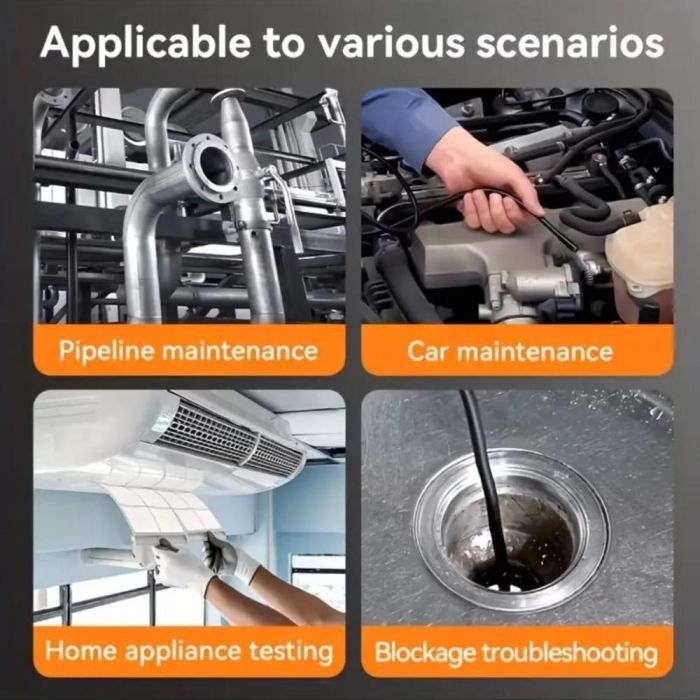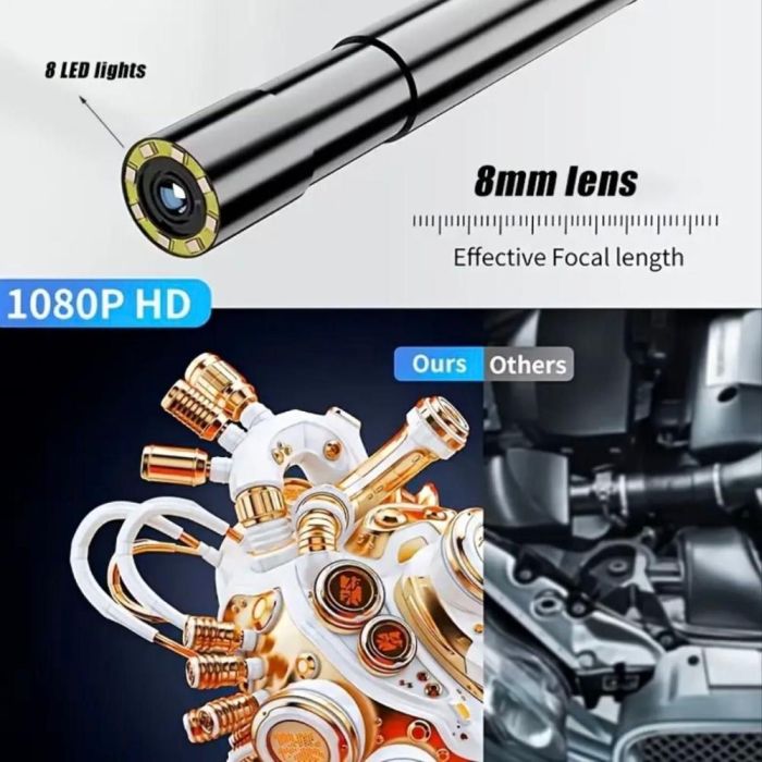 تم تجهيز كاميرا الفحص بمقدمة صغيرة الحجم قطر 8 مم، حيث يمكنها التسلل بسهولة إلى الأماكن التي يصعب الوصول إليها أو رؤيتها بمجرد النظر، تتميز بخاصية التصوير الفوتوغرافي والفيديو والتقاط الصور من لقطات الفيديو، مجهزة ببطارية قابلة للشحن تدوم طويلاً، شاشة IPS كبيرة ومصابيح LED قابلة للتعديل، كما أنها مثالية للاستخدام على نطاق واسع لإصلاح الأعطال المختلفة للسيارات، ومكيفات الهواء، وخطوط الأنابيب والصرف الصحي، أعمال الصيانة المنزلية