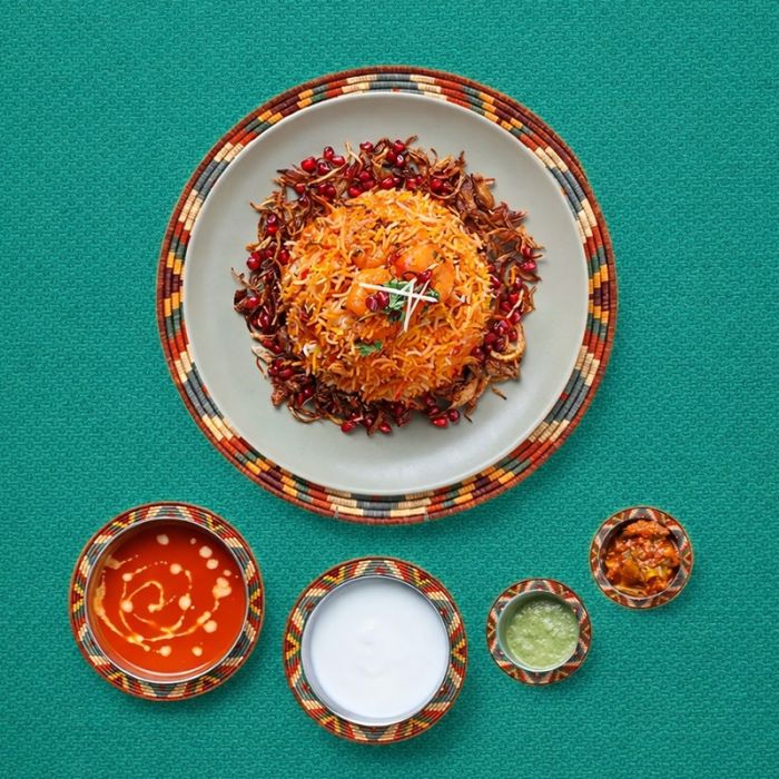 استمتع بنكهات برياني الدجاج أو اللحم الغنية والعطرة، المصنوعة من لحم طري والأرز البسمتي العطري