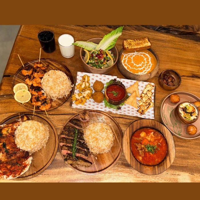 قائمة إفطار رمضانية تشمل مشروبات رمضان (فيمتو ولبن)، تمر، شوربة، سلطة، مقبلات ساخنة، قطع مشروم، سمبوسة مشكلة، حلومي مشوي، قرنبيط مقلي، مرق، أرز بالشعيرية، اختيار طبق رئيسي واحد (دجاج مشوي أو ستيك لحم تندرلوين أو روبيان متوسط)، وحلى (أم علي أو لقيمات).