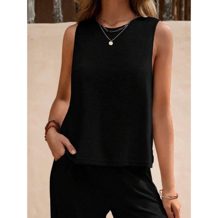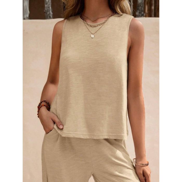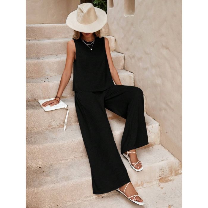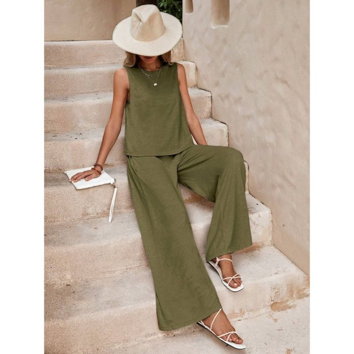 إطلالة صيفية أنيقة وعملية مع هذا الطقم الكاجوال المستوحى من التصميم الأوروبي. يتكون من توب بدون أكمام بقصة انسيابية وبنطال واسع الساق يمنحك حرية الحركة وأناقة بسيطة. الألوان الحيادية والتفاصيل الراقية مثل الإكسسوارات والقبعة تضيف لمسة فاخرة دون تكلّف. مثالي للنزهات، السفر، أو الإطلالات اليومية التي تجمع بين الراحة والرقي.صفقة اليوم هي طقم صيفى كاجوال من قطعتين بتصميم أوروبي للسيدات