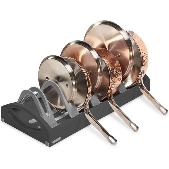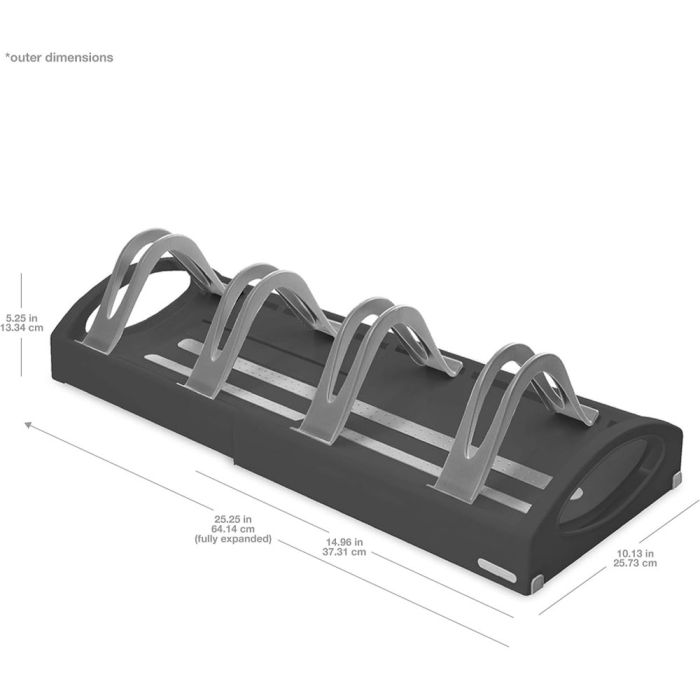 منظم أواني مطبخ قابل للتمديد مصنوع من بلاستيك متين عالي الجودة، يساعدك على ترتيب الحلل والمقالي بسهولة مع تصميم قابل للتعديل يوفر مساحة أكبر ويحافظ على أدواتك منظمة وآمنة داخل الخزانة.