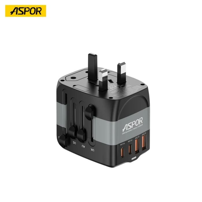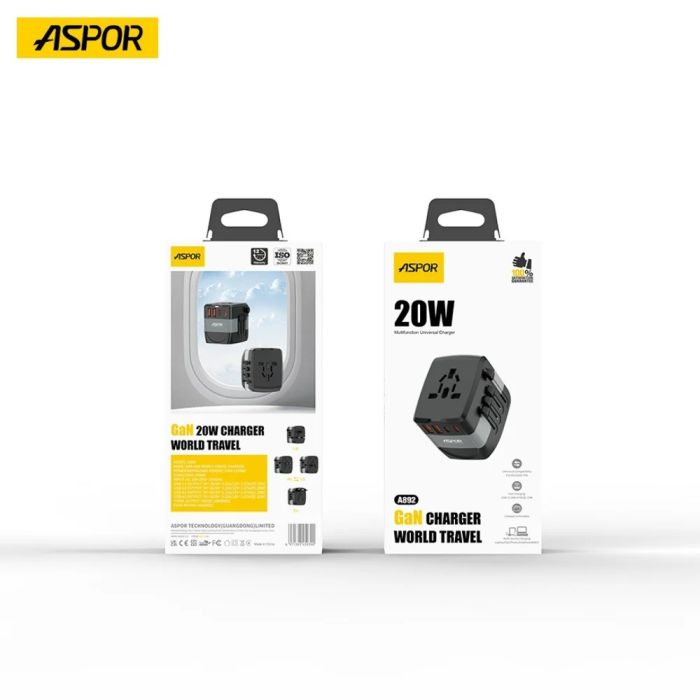 اشحن أجهزتك بأعلى سرعة مع شاحن السفر GaN من Aspor. بقدرة 20 واط وأربعة مخارج متعددة، يمكنك شحن الهواتف، الأجهزة اللوحية، وسماعات الأذن بكفاءة. حماية ضد الشحن الزائد والدوائر القصيرة تضمن أمان الاستخدام في أي مكان.