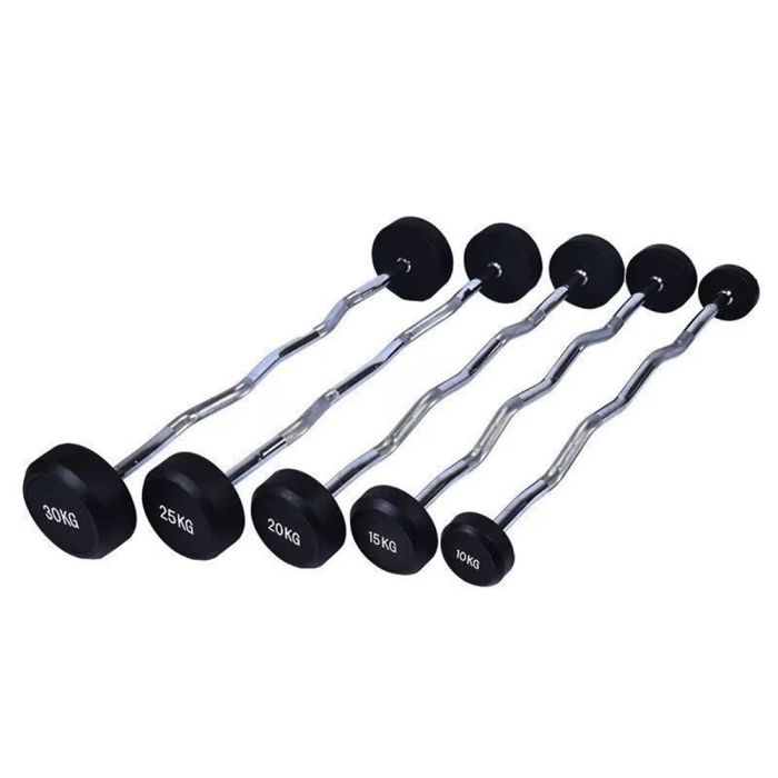 بار فولاذي مموج مزود بأوزان ثابتة مغلفة بطبقة مطاطية عالية الكثافة، يوفر راحة مثالية لقبضة اليد أثناء التمرين ويقلل الضغط على المعصم، مما يمنح أداءً متوازنًا لتقوية عضلات الذراعين والكتفين والصدر بثبات وجودة عالية.