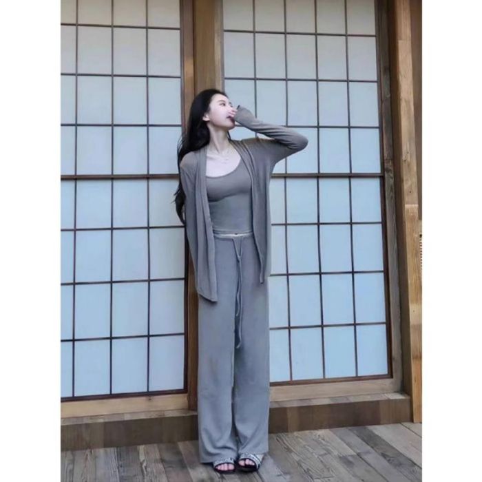 - يتكوّن من كارديجان خفيف، توب داخلي، وبنطلون بقصة واسعة