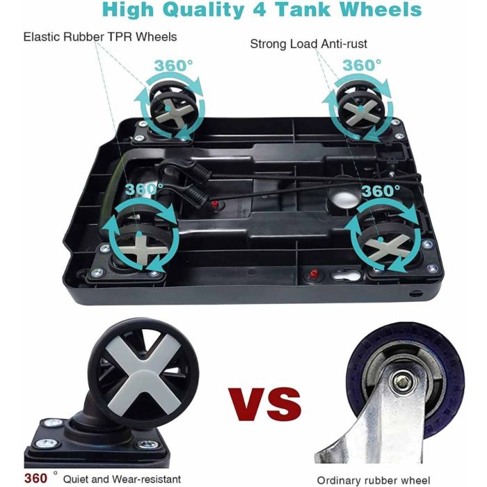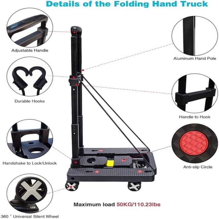 انقل أمتعتك وأغراضك بسهولة مع عربة اليد القابلة للطي ذات الأربع عجلات المصممة لتمنحك ثباتًا وسلاسة في الحركة. مزودة بعجلات تدور بزاوية 360 درجة وتعمل بهدوء تام، مما يجعلها مثالية للاستخدام على مختلف الأسطح. يمكن ضبط المقبض بثلاث مراحل ارتفاع لتوفير راحة مخصصة لكل مستخدم، كما يتيح المقبض الدوّار بزاوية 170 درجة السحب والدفع بسهولة حسب الحاجة. توفر القاعدة غير القابلة للانزلاق ثباتًا ممتازًا للأمتعة حتى وزن 50 كجم. خفيفة الوزن، قابلة للطي، وسهلة التخزين في ثوانٍ، مما يجعلها مثالية للسفر، التسوق، التنقل المكتبي أو المنزلي.