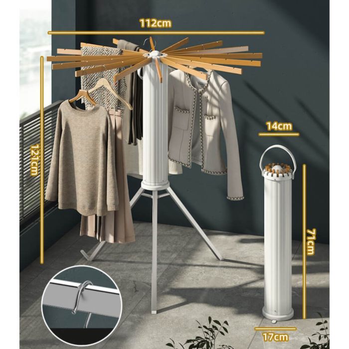 رف تعليق الملابس هو حل عصري وموفر للمساحة لتخزين وتجفيف ملابسك. يتميز بأذرع قابلة للسحب وقاعدة ثلاثية القوائم تسمح لك بتمديد الرف أو طيه بسهولة حسب الحاجة، دواسة قدم بتصميم مشبك لمزيد من الثبات، كما أنه مصنوع من خشب عالي الجودة مع قاعدة من الالومنيوم بلمسة نهائية طبيعية تكمل أي ديكور