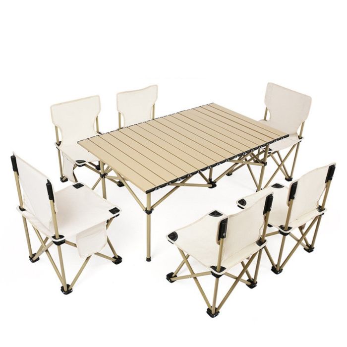 استمتع بتجربة تخييم فريدة مع طاولة وكراسي قابلة للطي بتصميم عملي ومتين. اختر بين طقم 4 أو 6 كراسي لتناسب احتياجاتك. خفيفة الوزن وسهلة التخزين، مع سطح طاولة واسع وكراسي مريحة بدعم مثالي للظهر. مثالية للنزهات والتخييم، بأبعاد مناسبة وجودة تدوم طويلاً