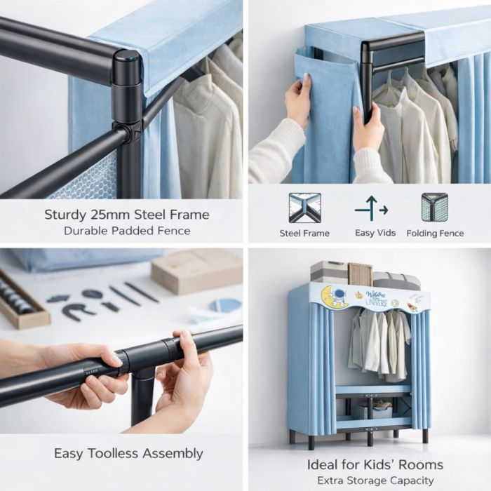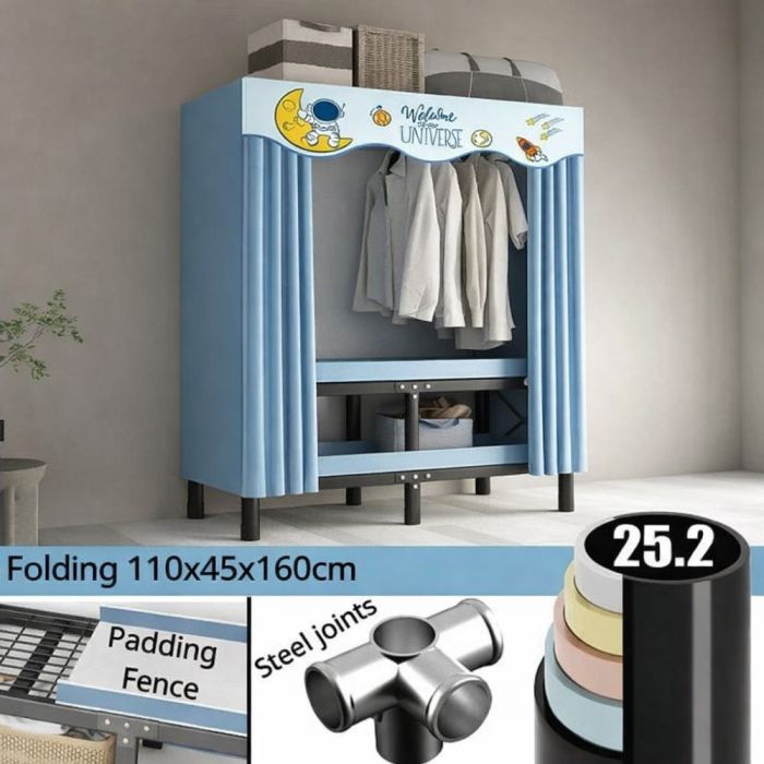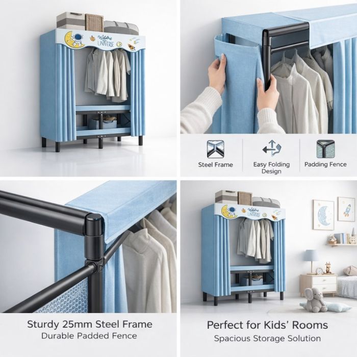 منظم ملابس قابل للطي مصنوع من إطار معدني قوي وغطاء قماشي عملي، يوفر مساحة واسعة لتنظيم الملابس بشكل مرتب مع تصميم موفر للمساحة. يتميز بسهولة الطي والفك لسرعة الاستخدام، مما يجعله مناسبًا لغرف النوم والاستخدام اليومي.
