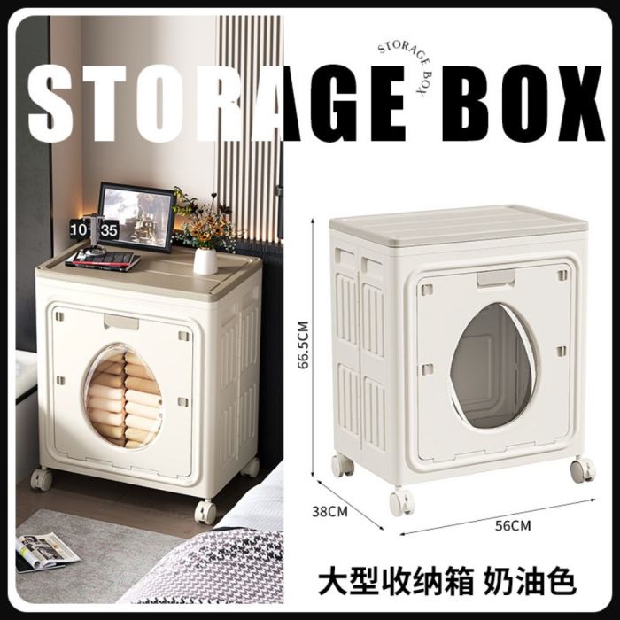 صندوق تخزين ملابس بغطاء قلاب قابل للطي مصنوع من بلاستيك PP متين، يوفر سعة كبيرة لتنظيم الملابس والمفروشات، باب أمامي لسهولة الوصول، مزود بعجلات للحركة السلسة داخل المنزل