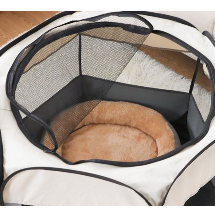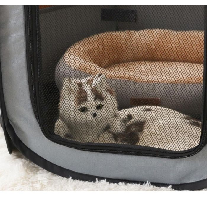 خيمة سداسية قابلة للطي للأليفة مصنوعة من خامة متينة تمنح مساحة آمنة ومريحة للحيوان، وتوفر تهوية ممتازة بفضل الجوانب الشبكية، كما تمنح حرية الحركة داخل المنزل أو خارجه، وتحافظ على جودتها مع الاستخدام المتكرر