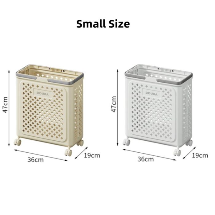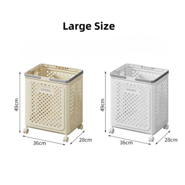 سلة غسيل متينة وقابلة للطي، مزودة بعجلات ومقابض للحمل السهل، مثالية لترتيب الملابس وتوفير المساحة في المنزل.