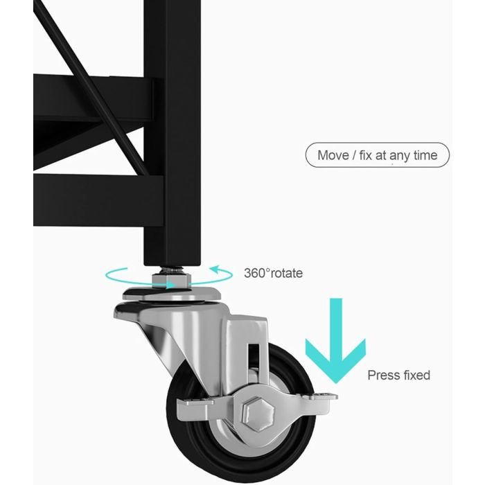 تمتاز رفوف التخزين بأنها سهلة التركيب دون الحاجة لأي أدوات. تحتوي الرفوف على عجلات قابلة للقفل لسهولة نقلها من مكان إلى آخر. تم صنع الرفوف من معدن عالي الجودة لاستخدام يدوم طويلاً.