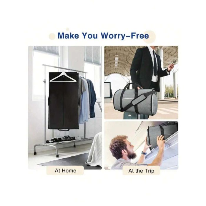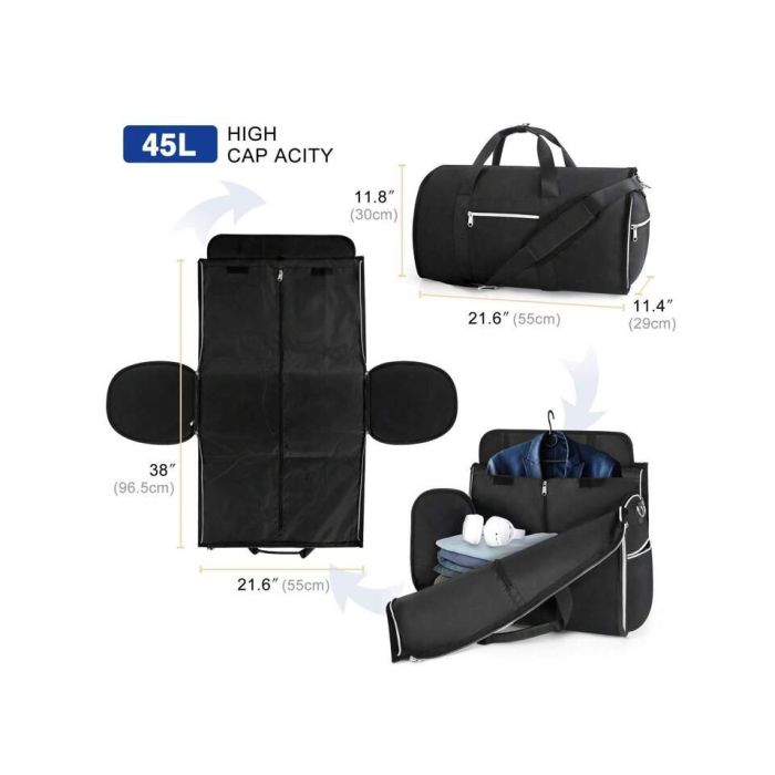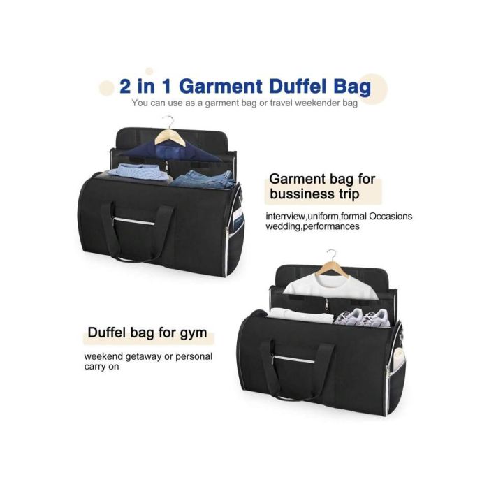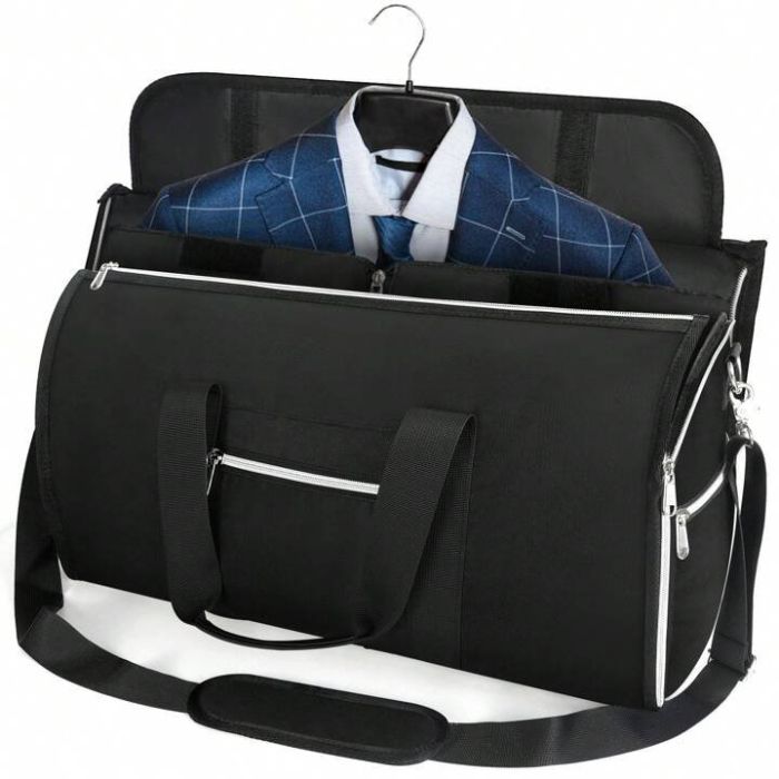 حقيبة فاخرة للحظات مميزة حيث يجتمع الأسلوب العملي مع الموضة. تتحول هذه الحقيبة النايلون المبتكرة من حقيبة واسعة لتخزين ملابسك دون تجاعيد إلى حقيبة سفر، مما يحافظ على ملابسك منظمة وجاهزة لأي مناسبة. يمكنك السفر بخفة والوصول بأناقة مع حقيبة مصممة للرحلات السريعة. تتميز بمساحة تخزين متنوعة للأحذية والهاتف وجواز السفر ومتعلقاتك الشخصية الأخرى، مجهزة بسحاب قوي، جيوب متعددة ومصنوعة من النايلون شديد التحمل، مما يجعلها رفيقك المثالي في السفر للعمل أو المتعة