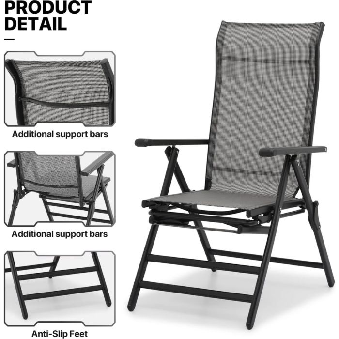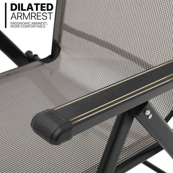 يتميز هذا الكرسي القابل للطي بتصميم يوفر الراحة والمتانة، حيث يأتي بإطار مصنوع من الألمنيوم عالي الجودة وقماش مقاوم للاهتراء، مما يمنحه قدرة ممتازة على مقاومة الصدأ وتقلبات الطقس للاستخدام الخارجي. كما تم تصميم مساند الذراعين ومسند الظهر المرتفع بشكل هندسي ليتوافق مع انحناءات الجسم ويوفر استرخاءً مثالياً. ويتيح مسند القدم القابل للسحب دعماً قابلاً للتعديل للساقين، مما يقلل الضغط ويحسن الدورة الدموية ليضمن راحة طويلة. يتمتع الهيكل بثبات قوي وقدرة تحمل تصل إلى 150 كيلوجراماً.