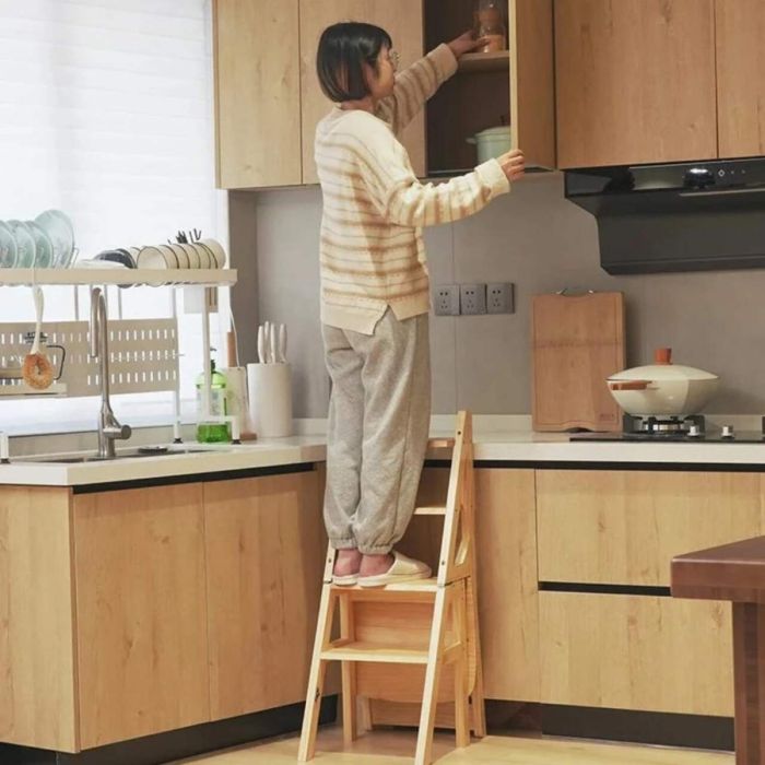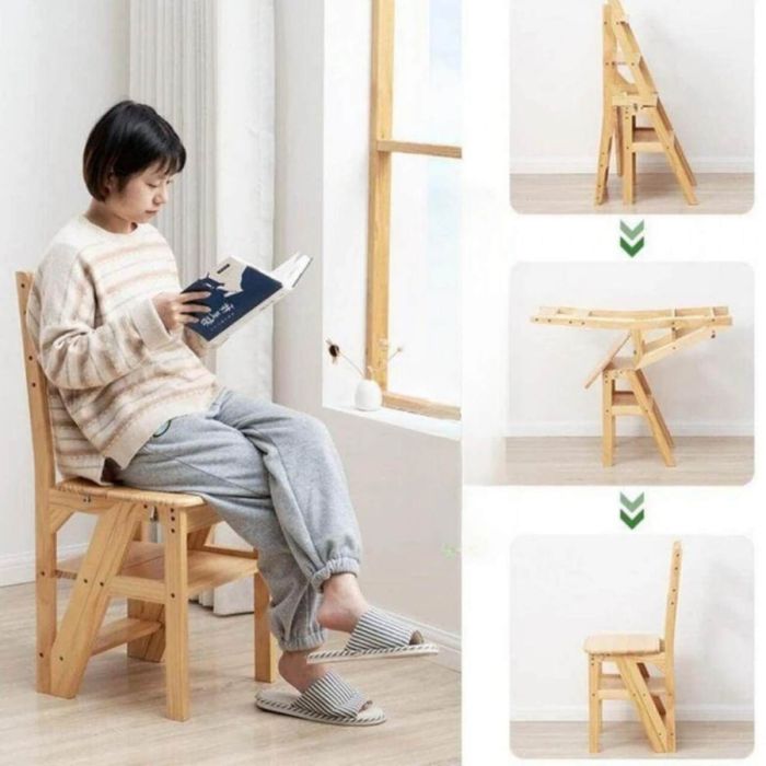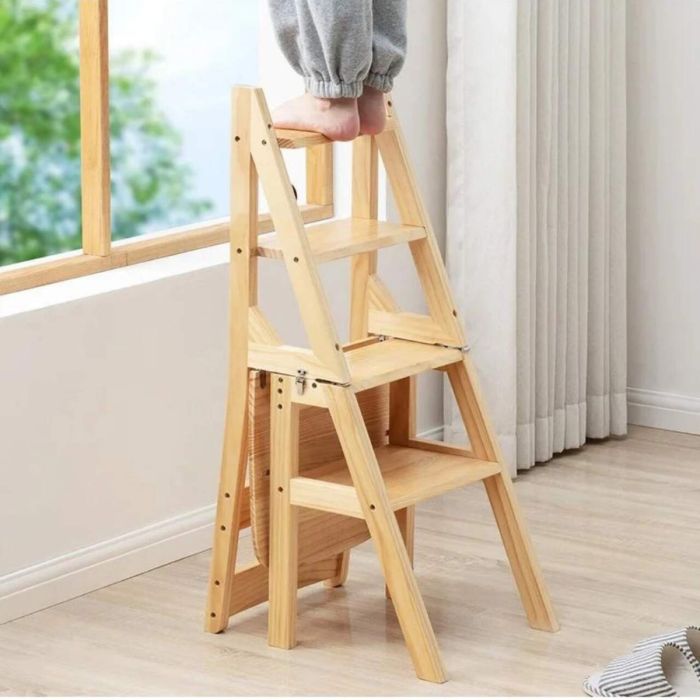 كرسي سلم متعدد الاستخدامات قابل للطي مصمم ليعمل ككرسي مريح وسلم عملي في نفس الوقت للاستخدام اليومي داخل المنزل. مصنوع من خشب طبيعي متين يوفر ثبات عالي ومظهر أنيق يناسب المطبخ أو أي مساحة داخلية. يتميز بتصميم ذكي يسمح بالتحويل بسهولة بين وضع الكرسي ووضع السلم، مما يجعله مثاليًا للوصول إلى الأماكن المرتفعة أو أداء المهام المنزلية المختلفة. كما أن تصميمه القابل للطي يساعد في توفير المساحة عند عدم الاستخدام، مع هيكل قوي يضمن تحمل الاستخدام اليومي بثبات.